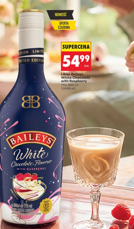 Liker Baileys White Chocolate with Raspberry w Biedronce można kupić teraz za 54,99 zł za butelkę o pojemności 500 ml, co daje 109,98 zł za litr. To słodki likier o smaku białej czekolady i malin, o zawartości alkoholu 17%. Idealnie nadaje się do przygotowania koktajli, delektowania się solo z lodem lub jako dodatek do deserów. Promocja w Biedronce pozwala zaoszczędzić na wyjątkowym trunku, który świetnie sprawdzi się podczas spotkań z przyjaciółmi lub jako prezent. Nie przegap okazji, by spróbować tego wyjątkowego połączenia smaków w atrakcyjnej cenie.