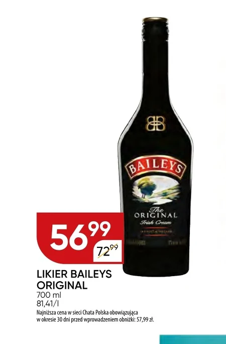 Likier Baileys Original, butelka o pojemności 700 ml, dostępny jest w ofercie Chata Polska w cenie 56,99 zł, co stanowi obniżkę z 72,99 zł. Cena litra to 81,41 zł, a najniższa cena w sieci Chata Polska w ciągu ostatnich 30 dni wynosiła 57,99 zł. Ten klasyczny kremowy likier idealnie nadaje się do picia na czysto, z lodem lub jako składnik wyrafinowanych koktajli, dodając im wyjątkowego smaku i aksamitnej konsystencji. Warto skorzystać z tej okazji i zaopatrzyć się w ulubiony likier w atrakcyjnej cenie.