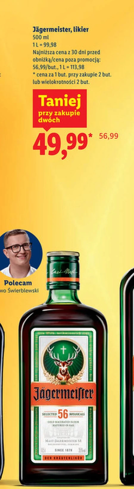 Jägermeister, likier w Lidlu dostępny jest w cenie 49,99 zł za butelkę 500 ml przy zakupie dwóch lub wielokrotności dwóch butelek, co daje 99,98 zł za litr. Gazetka Lidl informuje, że jest to najniższa cena z ostatnich 30 dni, wcześniej produkt kosztował 56,99 zł. Można go wykorzystać do przygotowania drinków lub picia w czystej formie.