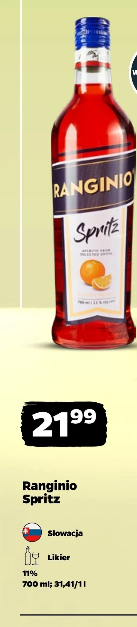 Likier Ranginio Spritz w cenie 21,99 zł za butelkę 700 ml dostępny jest w ofercie Netto. To słowacki trunek o zawartości alkoholu 11%, który sprawdzi się jako baza do orzeźwiających koktajli lub serwowany na luzie z lodem. Jego lekko owocowy smak i umiarkowana moc czynią go dobrym wyborem na letnie spotkania czy wieczorne relaksowanie. Warto skorzystać z okazji, by urozmaicić domowe zapasy trunków o coś nietuzinkowego.