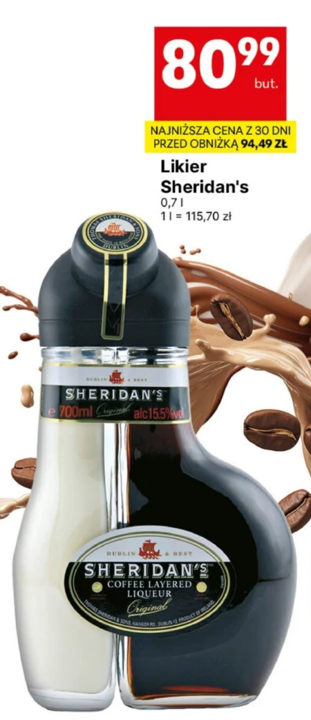 Likier Sheridan’s o pojemności 0,7 l jest dostępny w Delikatesy Centrum w cenie 80,99 zł, co stanowi najniższą cenę z ostatnich 30 dni – wcześniej kosztował 94,49 zł. Ten wyjątkowy likier doskonale sprawdzi się jako dodatek do kawy, składnik oryginalnych drinków lub jako wyrafinowany prezent. Jego charakterystyczny smak i aromat zadowolą nawet najbardziej wymagających koneserów. Warto skorzystać z tej okazji, ponieważ cena jest teraz szczególnie atrakcyjna. Oferta ważna od 2026-04-02 do 2026-04-15 Źródło: gazetka Delikatesy Centrum