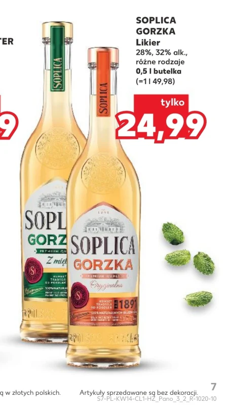 Soplica Gorzka likier dostępna jest w ofercie Kaufland w butelce o pojemności 0,5 litra w cenie 24,99 zł, zamiast 49,98 zł. To klasyczny, gorzki likier o zawartości alkoholu 28% lub 32%, idealny do spożywania w czystej formie, z lodem lub jako składnik koktajli. Różne rodzaje tego likieru zaspokoją gusta nawet najbardziej wymagających smakoszy, stanowiąc doskonały dodatek do specjalnych okazji lub chwili relaksu. Skorzystaj z tej okazji i zaopatrz się w wysokiej jakości likier w atrakcyjnej cenie.