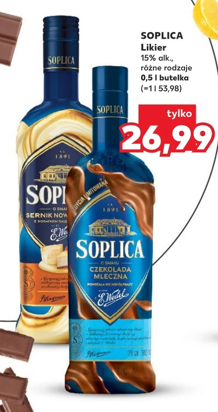SOPLICA, likier o mocy piętnastu procent, dostępna jest w ofercie Kaufland w cenie 26,99 za butelkę o pojemności pół litra, co daje 53,98 za litr. Różne rodzaje tego trunku to propozycja dla osób poszukujących klasycznego alkoholu do drinków lub spożywanego w czystej postaci. Likier Soplica sprawdzi się podczas spotkań z przyjaciółmi lub jako dodatek do deserów. Warto skorzystać z tej okazji i zaopatrzyć się w ulubiony smak w atrakcyjnej cenie.