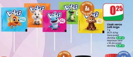 Lizak serce Lolli Argo 7 g 35,71 zł/kg Cena przed obniżką: 0,39 zł Najniższa cena z 30 dni przed obniżką: 0,29 zł