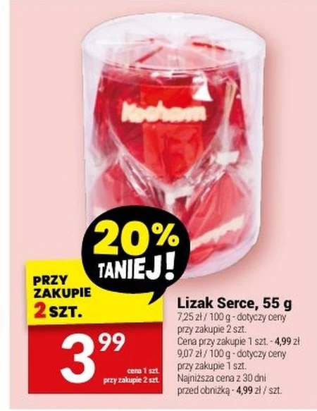 Lizak Serce, 55 g 7,25 zł / 100 g - dotyczy ceny przy zakupie 2 szt. Cena przy zakupie 1 szt. - 4,99 zł 9,07 zł / 100 g - dotyczy ceny przy zakupie 1 szt. Najniższa cena z 30 dni przed obniżką - 4,99 zł / szt.