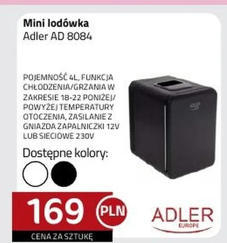 Mini lodówka Adler AD 8084 POJEMNOŚĆ 4L, FUNKCJA CHŁODZENIA/GRZANIA W ZAKRESIE 18-22 PONIŻEJ/ POWYŻEJ TEMPERATURY OTOCZENIA, ZASILANIE Z GNIAZDA ZAPALNICZKI 12V LUB SIECIOWE 230V
