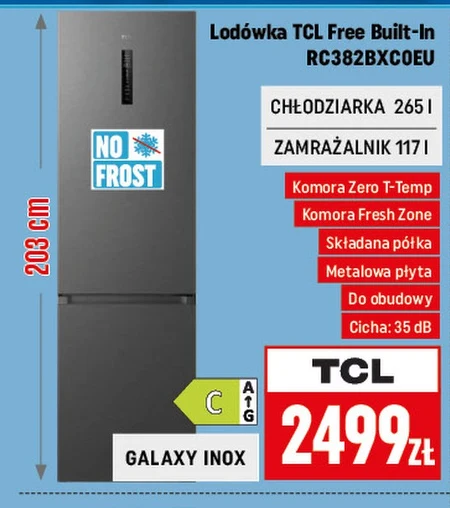 Lodówka TCL Free Built-In RC382BXC0EU CHŁODZIARKA 265 l ZAMRAŻALNIK 117 l Komora Zero T-Temp Komora Fresh Zone Składana półka Metalowa płyta Do obudowy Cicha: 35 dB