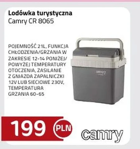 Lodówka turystyczna Camry CR 8065 POJEMNOŚĆ 21L, FUNKCJA CHŁODZENIA/GRZANIA W ZAKRESIE 12-14 PONIŻEJ/ POWYŻEJ TEMPERATURY OTOCZENIA, ZASILANIE Z GNIAZDA ZAPALNICZKI 12V LUB SIECIOWE 230V, TEMPERATURA GRZANIA 60-65