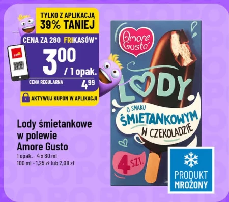 Lody śmietankowe w polewie Amore Gusto występują w ofercie POLOmarket w cenie 3,00 zł za opakowanie zawierające cztery sztuki po 60 ml, co daje 39% taniej niż cena regularna 4,99 zł. To doskonała propozycja na słodki deser lub orzeźwiającą przekąskę w ciepłe dni. Aby skorzystać z tej wyjątkowej oferty, należy aktywować kupon w aplikacji POLOmarket i zapłacić za opakowanie przy kasie. Oferta ważna od 2026-04-08 do 2026-04-14 Źródło: gazetka POLOmarket