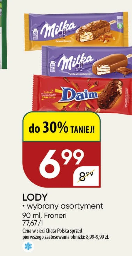 LODY · wybrany asortyment 90 ml, Froneri 77,67/1 Cena w sieci Chata Polska sprzed pierwszego zastosowania obniżki: 8,99-9,99 zł.