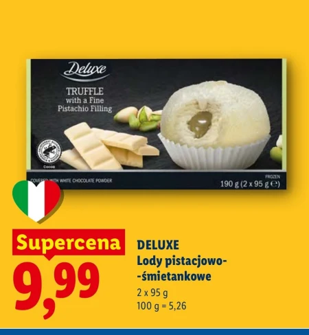 Lody pistacjowo-śmietankowe Deluxe występują w ofercie Lidl w supercenie 9,99 za opakowanie 2 x 95 g, co daje 100 g za 5,26. To wyjątkowo kremowe lody o wyraźnym smaku pistacji i delikatnej słodyczy śmietanki, idealne na gorące dni lub jako słodki deser. Doskonale sprawdzą się podczas spotkań z rodziną i przyjaciółmi, zapewniając orzeźwiającą chwilę przyjemności. Warto skorzystać z tej okazji, aby spróbować połączenia klasycznych smaków w wyjątkowej odsłonie.
