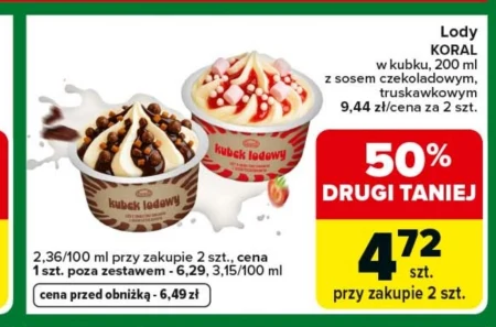 Lody KORAL w kubku, 200 ml z sosem czekoladowym, truskawkowym 9,44 zł/cena za 2 szt.