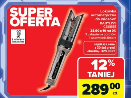 Lokówka automatyczna do włosów występuje w ofercie Carrefour w cenie 289,00 zł, co stanowi 12% taniej niż najniższa cena z ostatnich 30 dni, wynosząca 329,00 zł. To urządzenie ułatwi stworzenie idealnych loków bez konieczności manualnego kręcenia włosów, oferując komfort i szybkość stylizacji. Posiada trzy ustawienia obrotów oraz cztery ustawienia timera, pozwalając na dopasowanie parametrów do indywidualnych potrzeb i rodzaju włosów. Wykorzystaj tę okazję i ciesz się profesjonalnym efektem w zaciszu swojego domu. Oferta ważna od 2026-04-13 do 2026-05-02 Źródło: gazetka Carrefour