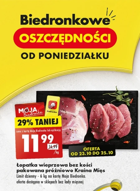 Łopatka wieprzowa bez kości pakowana próżniowo Kraina Mięs Limit dzienny - 6 kg na kartę Moja Biedronka. oferta dostępna w sklepach bez lady mięsnej