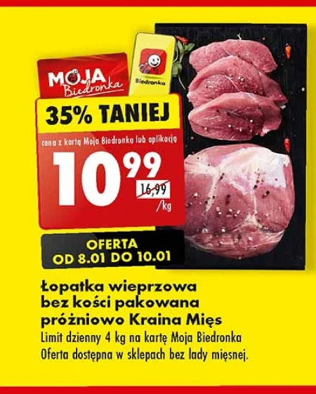 Łopatka wieprzowa bez kości pakowana próżniowo Kraina Mięs Limit dzienny 4 kg na kartę Moja Biedronka Oferta dostępna w sklepach bez lady mięsnej.