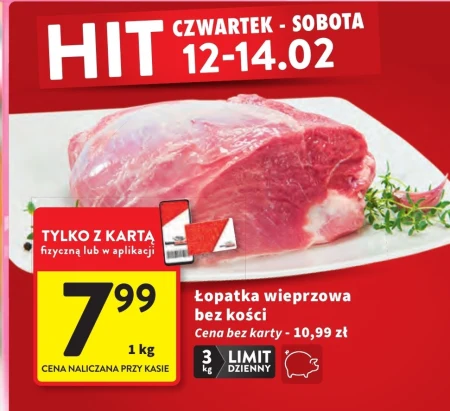Łopatka wieprzowa bez kości Cena bez karty - 10,99 zł Soczysta łopatka wieprzowa bez kości to doskonałe mięso na kotlety, gulasz, pieczeń z piekarnika czy aromatyczne dania jednogarnkowe, które sprawdzą się na obiad dla całej rodziny. Dzięki odpowiedniej zawartości tłuszczu świetnie nadaje się do duszenia, pieczenia i wolnego gotowania, gwarantując kruchość, intensywny smak i idealną bazę do tradycyjnych potraw kuchni polskiej.