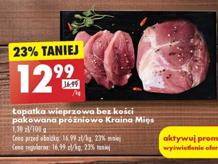 Łopatka wieprzowa bez kości pakowana próżniowo Kraina Mięs 1,30 zł/100 g Cena przed obniżką: 16,99 zł/kg, 23% mniej Cena regularna: 16,99 zł/kg, 23% taniej