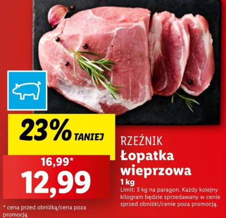 Łopatka wieprzowa 1 kg Limit: 3 kg na paragon. Każdy kolejny kilogram będzie sprzedawany w cenie sprzed obniżki/cenie poza promocją.