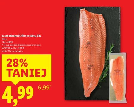 Łosoś atlantycki, filet ze skórą, XXL 100 g 1 kg = 49,90 * cena przed obniżką/cena poza promocją: 6,99/100 g, 1 kg = 69,90 Limit: 3 kg na paragon.