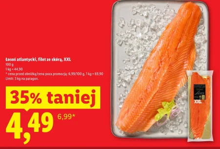 Łosoś atlantycki, filet ze skórą XXL jest dostępny w ofercie Lidl w cenie 4,49 za 100 gramów, co daje 44,90 za kilogram – obniżka wynosi 35% z ceny 6,99. Ten wysokiej jakości filet ze skórą to doskonały wybór dla miłośników zdrowej i smacznej kuchni. Idealnie nadaje się do pieczenia, smażenia na patelni, a także przygotowywania sushi czy łososia w sosie. Nie przegap okazji, aby spróbować tego wyjątkowego łososia w atrakcyjnej cenie, pamiętając o limicie zakupu – maksymalnie 3 kg na paragon.