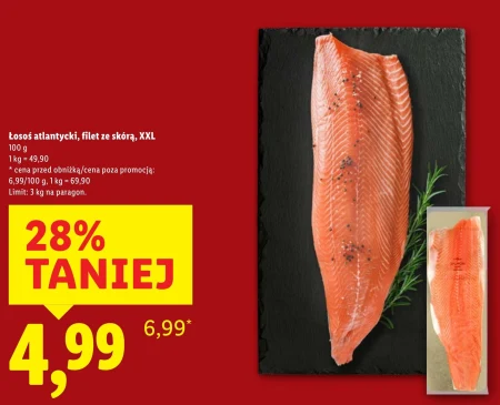 Łosoś atlantycki, filet ze skórą, XXL 100 g 1 kg = 49,90 * cena przed obniżką/cena poza promocją: 6,99/100 g, 1 kg = 69,90 Limit: 3 kg na paragon.
