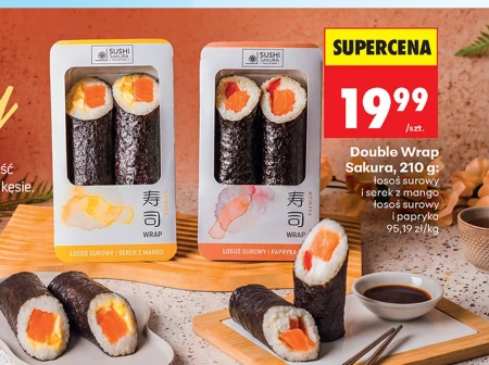 Double Wrap Sakura jest dostępny w ofercie Biedronka w cenie 19,99 zł za sztukę, co daje 95,19 zł za kilogram, przy wadze 210 g. Produkt łączy w sobie delikatny smak surowego łososia z kremowym serem mango oraz wyrazistą papryką, tworząc unikalne połączenie smaków. To idealna propozycja na szybki i smaczny posiłek lub przekąskę dla osób ceniących sobie świeżość i oryginalność składników. Warto skorzystać z tej wyjątkowej okazji, aby spróbować tej ciekawej kompozycji smaków w atrakcyjnej cenie. Oferta ważna od 2026-04-29 do 2026-05-06 Źródło: gazetka Biedronka