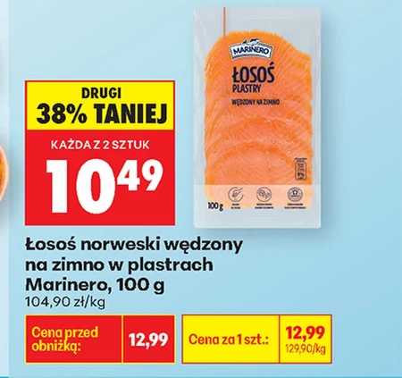Łosoś norweski wędzony na zimno w plastrach występuje w ofercie Biedronka w cenie 104,90 zł/kg. Przy zakupie dwóch sztuk można skorzystać z promocji i zapłacić tylko 10,49 zł za każdą, co stanowi 38% zniżki względem ceny regularnej 12,99 zł. Delikatny smak i aromatyczny zapach tego łososia idealnie sprawdzają się zarówno jako dodatek do kanapek, jak i wykwintna przekąska. Wędzony na zimno w plastrach, jest gotowy do spożycia od razu po otwarciu opakowania. Warto wykorzystać tę okazję, aby zaopatrzyć się w wysokiej jakości produkt w atrakcyjnej cenie. Oferta ważna od 2026-04-13 do 2026-04-18 Źródło: gazetka Biedronka