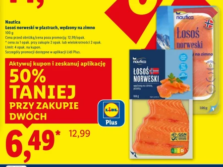 Nautica Łosoś norweski w plastrach, wędzony na zimno 100 g Cena przed obniżką/cena poza promocją: 12,99/opak. * cena za 1 opak. przy zakupie 2 opak. lub wielokrotności 2 opak. Limit: 4 opak. na kupon. Szczegóły promocji dostępne w aplikacji Lidl Plus.