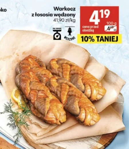 Warkocz z łososia wędzonego 41,90 zł/kg Warkocz z łososia wędzonego dostępny w Delikatesach Centrum to propozycja dla miłośników wykwintnych smaków. Idealnie sprawdzi się jako elegancka przystawka, dodatek do kanapek czy bogata sałatki. Delikatny, wędzony łosoś zachwyca aromatem i konsystencją, a charakterystyczny kształt warkocza nadaje daniu wyjątkowego wyglądu. Warto zwrócić uwagę na atrakcyjną cenę 41,90 zł/kg w najnowszej gazetce promocyjnej Delikates Centrum.