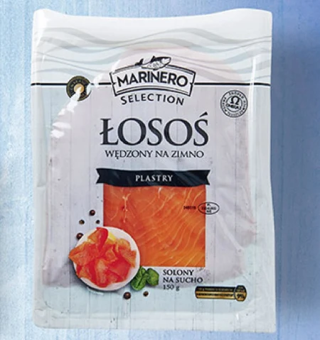 Łosoś norweski wędzony na zimno w plastrach. Opakowanie 150 gram.