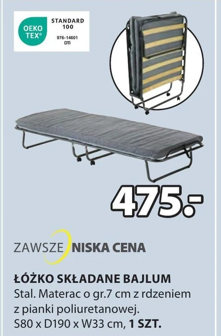 ŁÓŻKO SKŁADANE BAJLUM Stal. Materac o gr.7 cm z rdzeniem z pianki poliuretanowej. S80 × D190 x W33 cm, 1 SZT.