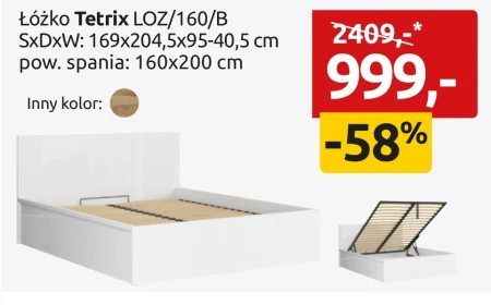 Łóżko Tetrix LOZ/160/B w Black Red White dostępne jest teraz za 999,- zamiast 2409,- dzięki promocji obniżającej cenę aż o 58%. Łóżko ma wymiary 169x204,5x95-40,5 cm i powierzchnię spania 160x200 cm, idealnie sprawdzi się w sypialni. Sprawdź aktualną ofertę Black Red White i wyposaż swoją przestrzeń w komfortowy mebel w atrakcyjnej cenie.