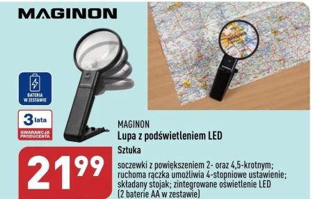 MAGINON Lupa z podświetleniem LED Sztuka soczewki z powiększeniem 2- oraz 4,5-krotnym; ruchoma rączka umożliwia 4-stopniowe ustawienie; składany stojak; zintegrowane oświetlenie LED (2 baterie AA w zestawie)