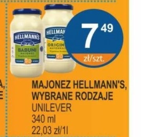 MAJONEZ HELLMANN'S, WYBRANE RODZAJE UNILEVER 340 ml 22,03 zł/1l