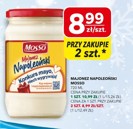 MAJONEZ NAPOLEOŃSKI MOSSO 720 ML CENA PRZY ZAKUPIE 1 SZT. 10,99 ZŁ (1 L/15,26 ZŁ) CENA ZA 1 SZT. PRZY ZAKUPIE 2 SZT. 8,99 ZŁ/SZT. (1 L/12,49 ZŁ)