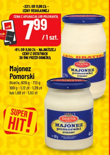 Majonez Pomorski Ocetix, 620 g – 713 g 100 g – 1,12 zł – 1,29 zł lub 1,68 zł – 1,93 zł -33% OD 11,99 zł - CENY REGULARNEJ CENA Z APLIKACJĄ LUB POLOKARTĄ 7,99 / 1 szt. -9% OD 8,80 zł - NAJNIŻSZEJ CENY Z OSTATNICH 30 DNI PRZED OBNIŻKĄ Majonez Pomorski Ocetix o pojemności od 620 do 713 gramów kupisz w POLOmarket już od 7,99 zł za sztukę. To klasyczny sos o wyrazistym smaku, idealny do sałatek, kanapek czy dań na zimno, który sprawdzi się zarówno w codziennym menu, jak i podczas okazjonalnych posiłków. Produkt wyróżnia się delikatną konsystencją i naturalnym aromatem, dzięki czemu doskonale komponuje się z różnorodnymi składnikami. Obecna promocja to świetna okazja, by zaopatrzyć się w ulubiony majonez w korzystnej cenie – warto skorzystać z okazji, zanim oferta się zmieni.