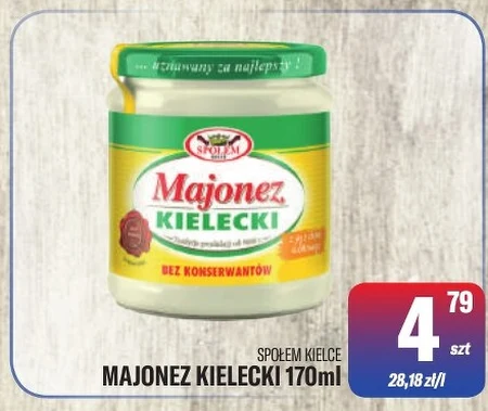 Majonez Kielcki Społem Kielce w promocji 4 sztuki za 79 złotych, co daje cenę 28,18 zł za litr. Oferta dostępna w Tomi Markt. Gramatura pojedynczego opakowania to 170 ml. Można go wykorzystać jako bazę do sosów, sałatek lub bezpośrednio do kanapek.
