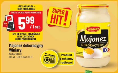 Majonez dekoracyjny Winiary Nestlé, 400 ml 100 ml – 1,50 zł lub 2,37 zł -36% OD 9,49 zł - CENY REGULARNEJ CENA Z APLIKACJĄ LUB POLOKARTĄ 5,99 /1 szt. -31% OD 8,79 zł - NAJNIŻSZEJ CENY Z OSTATNICH 30 DNI PRZED OBNIŻKĄ Majonez dekoracyjny Winiary od Nestlé w opakowaniu 400 ml dostępny jest teraz w wyjątkowej cenie 5,99 zł z aplikacją lub Polokartą POLOmarket, obniżonej z 9,49 zł. To oszczędność 36% względem ceny regularnej, a także 31% względem najniższej ceny z ostatnich 30 dni. Idealny do kanapek, sałatek i jako baza do sosów – skorzystaj z promocji w POLOmarket i zaopatrz się w sprawdzony majonez Winiary.