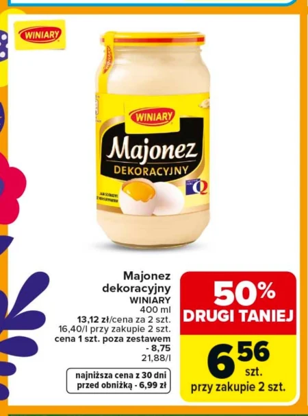Majonez WINIARY dekoracyjny w Carrefour można kupić teraz w promocji 2 sztuk za 13,12 zł, co daje cenę litra 16,40 zł przy zakupie dwóch opakowań. Kupując dwie sztuki, zapłacisz tylko 6,56 zł za każdy majonez, korzystając z promocji „Drugi taniej 50%”. Pojemność jednego opakowania to 400 ml, a cena jednostkowa poza promocją wynosi 8,75 zł, co przekłada się na 21,88 zł za litr, co jest najniższą ceną w ciągu ostatnich 30 dni. Ten majonez idealnie sprawdzi się do przygotowywania kanapek, sałatek i dipów.