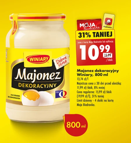 Majonez dekoracyjny Winiary, 800 ml 13,74 zł/l Najniższa cena z 30 dni przed obniżką: 11,99 zł/słoik, 8% mniej Cena regularna: 15,99 zł/słoik (19,99 zł/l), 31% taniej Limit dzienny - 4 słoiki na kartę Moja Biedronka.