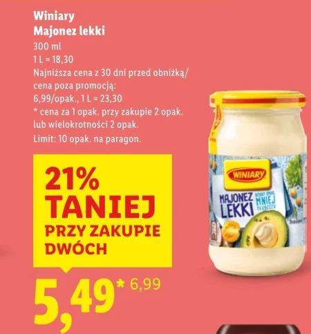 Winiary Majonez lekki 300 ml 1 L = 18,30 Najniższa cena z 30 dni przed obniżką/ cena poza promocją: 6,99/opak., 1 L = 23,30 * cena za 1 opak. przy zakupie 2 opak. lub wielokrotności 2 opak. Limit: 10 opak. na paragon.