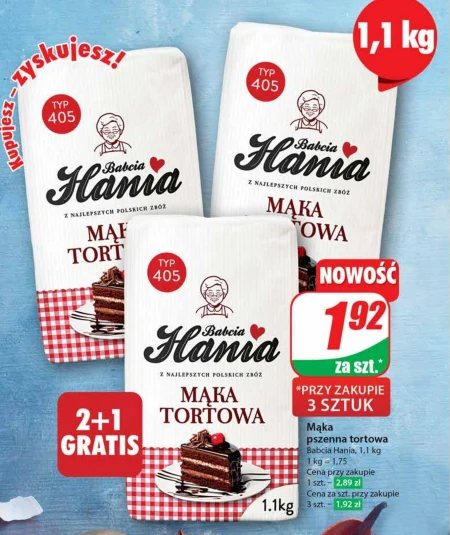 Mąka pszenna tortowa Babcia Hania, 1,1 kg 1 kg = 1,75 Cena przy zakupie 1 szt. - 2,89 zł Cena za szt. przy zakupie 3 szt. - 1,92 zł