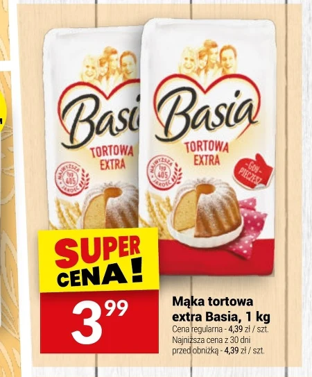 Mąka tortowa extra Basia dostępna jest w Twój Market w cenie 3,99 zł za 1 kg. To wysokiej jakości mąka przeznaczona do wypieku delikatnych ciast, biszkoptów oraz tortów. Produkt wyróżnia się drobnym przesianiem, co zapewnia puszystość wypiekom. Aktualnie to najniższa cena w ciągu ostatnich 30 dni, więc warto zaopatrzyć się w tę mąkę, aby przygotować ulubione słodkości.