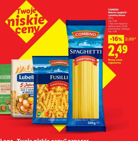 Makaron spaghetti Combino jest dostępny w ofercie Lidl w cenie 2,49 za opakowanie 500 g, co daje 4,98 za kilogram. Aktualna cena jest obniżona o 16% z 2,99. Ten klasyczny makaron z pszenicy durum to doskonały wybór do przygotowania ulubionych dań, takich jak spaghetti bolognese, aglio e olio czy carbonara. Sprawdzi się zarówno w szybkim lunchu, jak i podczas rodzinnego obiadu. Warto wykorzystać tę okazję i zaopatrzyć się w porządną porcję makaronu w atrakcyjnej cenie. Oferta ważna od 2026-04-13 do 2026-04-15 Źródło: gazetka Lidl
