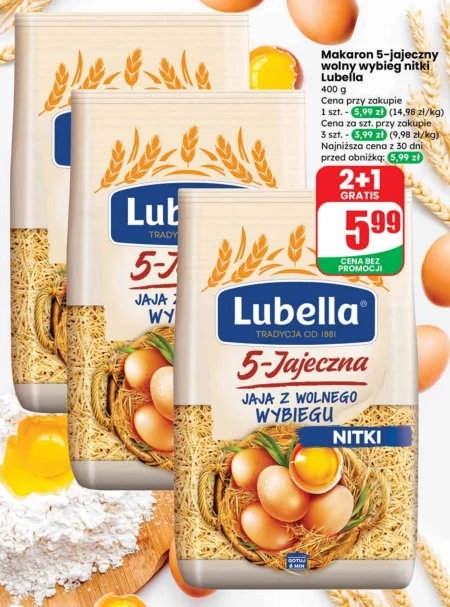 Makaron 5-jajeczny wolny wybieg nitki Lubella 400 g Cena przy zakupie 1 szt. - 5,99 zł (14,98 zł/kg) Cena za szt. przy zakupie 3 szt. - 3,99 zł (9,98 zł/kg) Najniższa cena z 30 dni przed obniżką: 5,99 zł