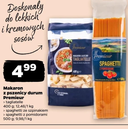Makaron z pszenicy durum Premier > tagliatelle 400 g; 12,48/1 kg > spaghetti ze szpinakiem > spaghetti z pomidorami 500 g; 9,98/1 kg Idealny do przygotowania aromatycznych dań kuchni włoskiej, makaron z pszenicy durum Premier doskonale sprawdzi się jako baza do klasycznych sosów carbonara, bolognese czy pesto. Dzięki wysokiej zawartości białka i wyjątkowej trwałości podczas gotowania, tagliatelle świetnie komponuje się z kremowymi sosami śmietanowymi oraz warzywami, tworząc sycące i pełnowartościowe posiłki dla całej rodziny. Wzbogacony naturalnymi dodatkami, makaron spaghetti ze szpinakiem lub pomidorami to doskonały sposób na urozmaicenie codziennych obiadów, dodając im koloru i wartości odżywczych. Szybki w przygotowaniu i uniwersalny, idealnie nadaje się do lekkich sałatek makaronowych, zapiekanek czy dań jednogarnkowych, dostarczając energii i witamin z warzyw. Wyjątkowo elastyczny i odporny na rozgotowanie, makaron Premier zachowuje idealną konsystencję al dente, co czyni go ulubionym wyborem do domowych eksperymentów kulinarnych. Doskonały do mrożenia i odgrzewania, sprawdzi się w szybkich daniach na wynos, lunchboxach czy jako element cateringu dietetycznego.