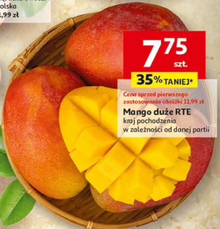 Mango duże RTE dostępne jest w ofercie Auchan w cenie 7,75 zł, co oznacza obniżkę o 35% w stosunku do ceny sprzed obniżki wynoszącej 11,99 zł. Ten dojrzały owoc, gotowy do spożycia, jest idealny jako zdrowa przekąska lub dodatek do deserów i sałatek. Pochodzi z różnych krajów, w zależności od aktualnej partii, co zapewnia różnorodność smaków i aromatów. Warto skorzystać z tej okazji, aby cieszyć się smakiem soczystego mango w atrakcyjnej cenie. Oferta ważna od 2026-04-09 do 2026-04-15 Źródło: gazetka Auchan