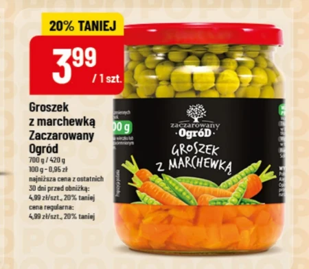 Groszek z marchewką Zaczarowany D Ogród 700 g / 420 g 100 g - 0,96 zł najniższa cena z ostatnich 30 dni przed obniżką: 4,99 zł/szt., 20% taniej cena regularna: 4,99 zł/szt., 20% taniej
