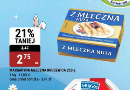 MARGARYNA MLECZNA KRUSZWICA 250 g 1 kg - 11,00 zł cena przed obniżką - 3,47 zł Kruszwica to tradycyjna margaryna mleczna, idealna do smarowania pieczywa i przygotowywania wypieków. Teraz w Bi1 dostępna w wyjątkowej cenie – tylko 2,75 zł za 250 g, co daje 11 zł za kilogram. Wykorzystaj okazję i zaopatrz się w sprawdzony produkt, który nadaje potrawom wyjątkowego smaku. W Bi1 oszczędzasz na każdym etapie gotowania!