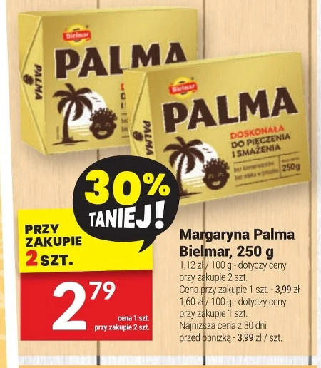 Margarina Palma Bielmar, 250 g 1,12 zł / 100 g - dotyczy ceny przy zakupie 2 szt. Cena przy zakupie 1 szt. - 3,99 zł 1,60 zł / 100 g - dotyczy ceny przy zakupie 1 szt. Najniższa cena z 30 dni przed obniżką - 3,99 zł / szt. Wielofunkcyjna margaryna Palma Bielmar doskonale sprawdzi się jako baza do smażenia, pieczenia ciast i przygotowywania kanapek, zapewniając wyrazisty smak i odpowiednią konsystencję. Wykorzystanie margaryny do dań kuchni polskiej, takich jak kluski śląskie czy kopytka, gwarantuje tradycyjny smak i aromat, a korzystna cena promocyjna pozwala na zaoszczędzenie w domowym budżecie. Ta uniwersalna margaryna do pieczenia i smażenia to niezbędny składnik w każdej kuchni, idealny dla miłośników domowych wypieków i codziennych posiłków.